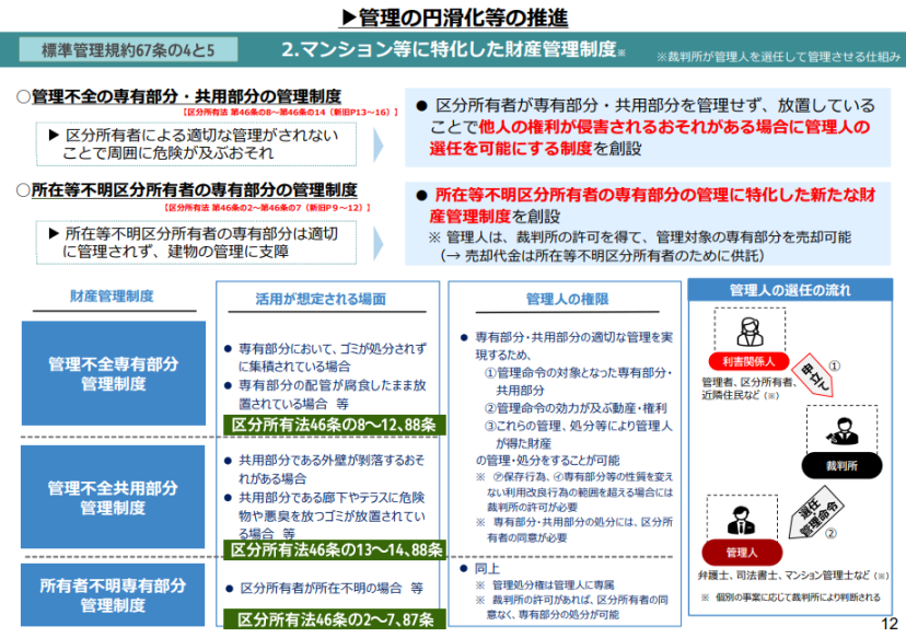 専有部分について、所有者の所在が不明・管理が不十分な場合には、裁判所が選任した所有者不明専有部分管理人または管理不全専有部分管理人が、専有部分の管理を行う仕組みができました。共用部分についても管理が不十分な場合に、管理不全共用部分管理人が選任され、共用部分の管理を行う仕組みが設けられました。